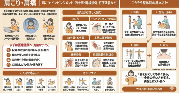 「長時間のデスクワークで肩が重い」「夜間に痛くて眠れない」「腕を挙げると引っかかる」――
